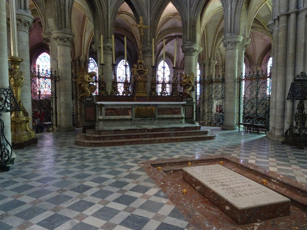 Daar ligt hij dan, of althans zijn dijbeen. Het is alles wat in de Franse Revolutie van zijn beenderen overbleef. De kerk bleef staan en ook Tweede Wereldoorlog kwam ze ongeschonden door, in tegenstelling tot de rest van de stad. U ziet waarschijnlijk dat niet alles Romaans is. Aan de spitse bogen herkent u een gotische verbouwing.