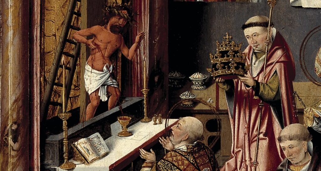 Dat de wijn echt verandert in Christus’ bloed, was voor velen moeilijk te geloven. Zo kreeg paus Gregorius de Grote (reg. 590-604) tijdens een mis eens te maken met iemand die eraan twijfelde. Plots stapte Christus van het kruis en schonk de miskelk vol. Deze legende is bekend als de Gregoriusmis. Het werd een populaire voorstelling, vooral in de vijftiende eeuw. Dit schilderij van de Meester van de Levensbron in het Catharijneconvent is nogal druk, dus we hebben een detail voor u uitgelicht: