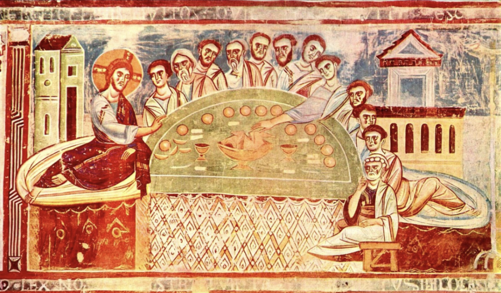 In dit Laatste Avondmaal van rond 1100 in de Sant’Angelo in het Zuid-Italiaanse Formis ziet u een laat voorbeeld van Christus en de discipelen die liggend van hun maaltijd gebruik maken, zoals de Romeinen dat deden. Naast een gebraad en al dan niet gebroken brood moet natuurlijk ook wijn aanwezig zijn. Daarover zei Jezus immers dat het zijn bloed was. Tijdens de Rooms-katholieke misviering zegent de priester de wijn, waarop de transsubstantiatie plaatsvindt: wijn wordt bloed.