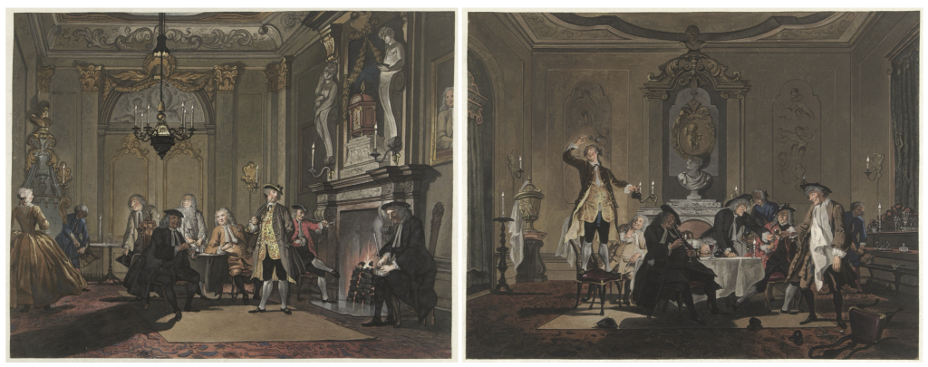 De Amsterdamse Sara Troost kopieerde omstreeks 1770 een populaire serie afbeeldingen van haar vader Cornelis. Op het eerste schilderij over een avondje mannen onder elkaar is het nog heel rustig. Haast saai. Maar op het vierde en voorlaatste uit de serie is er al veel drank in de man. Goede manieren zijn van tafel en sommige heren zijn ook al van de kaart. Het was een tafereel om de elite te kakken te zetten.
